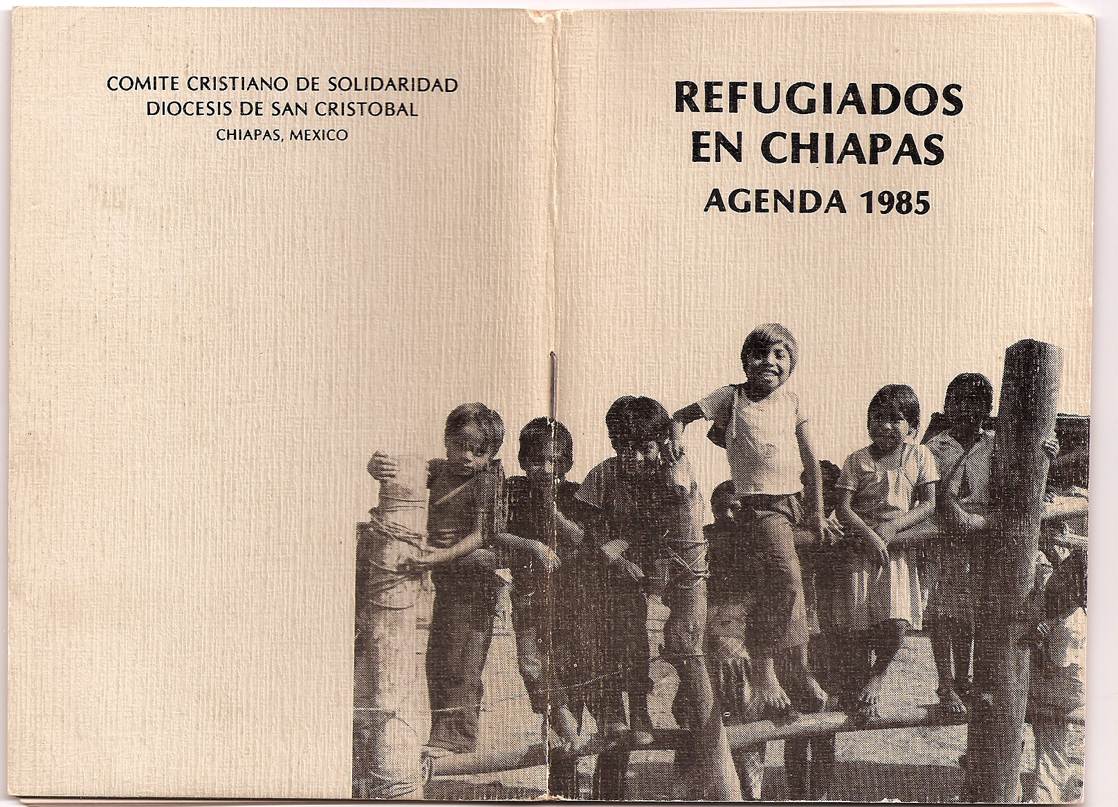 My friend Jon and I were on an extended tour of Mexico and had arrived in the popular and picturesque highland city of San Cristóbal, Chiapas. We happened into the bookshop of the Catholic Diocese, where we saw reminders of things that had been in the news: a poster with the modified tourist slogan: “Guatemala – Land of Eternal Springtime Repression;” a small weekly planner “Refugees in Chiapas;” and a booklet about refugees.