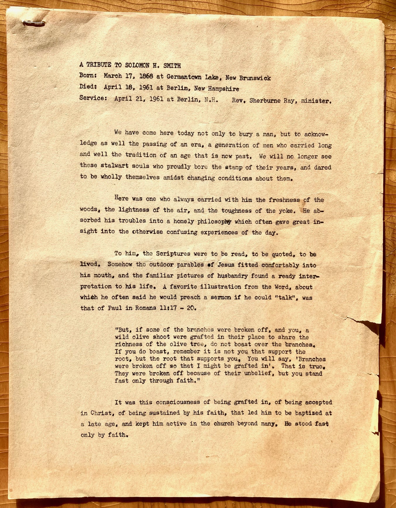In preparing this post, I’ve learned that Solomon Smith was not, as I had always imagined, one who felled trees; rather, he worked mostly in paper mills. Berlin, New Hampshire, was a major paper mill town and the home of an industry giant, Brown Company. Solomon’s 89th birthday was commemorated in the company publication, “The Brown Bulletin.”